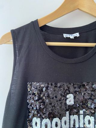 Camiseta negra para mujer, de la marca francesa Claudie Pierlot. Sin mangas y con detalle de lentejuelas en delantero. Talla 2, que corresponde a una M. Se le nota un poco el uso en la sisa porque tiene un poco de peeling.