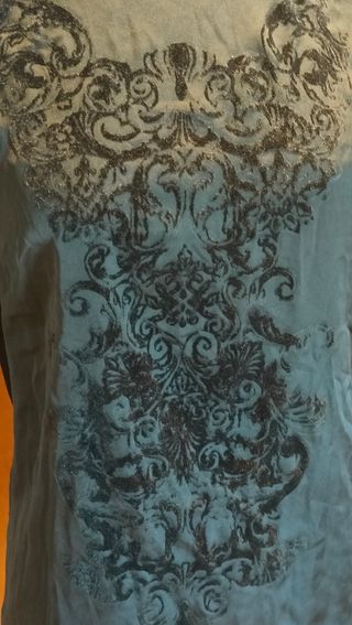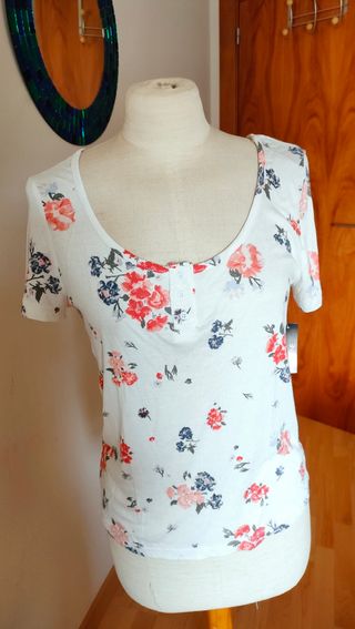 Preciosa camiseta de la marca Cortefiel. Es de color verde azulado y tiene un estampado floral precioso un poco brillante. - Es de manga corta. - El tejido parece suave y fluido. - Tiene un corte favorecedor.