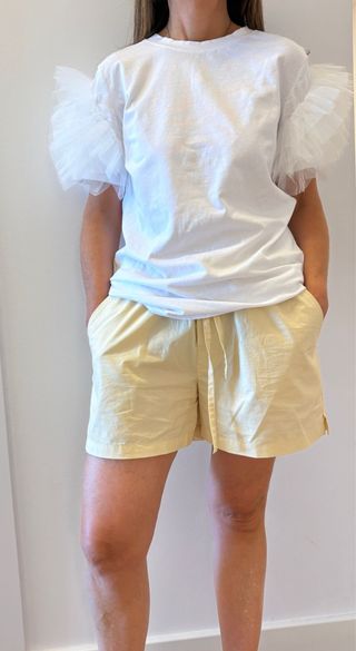 Preciosa blusa de algodón blanco con mangas de tul. Es una prenda delicada y elegante, ideal para ocasiones especiales. - Mangas con diseño de tul. - Acabados impecables.