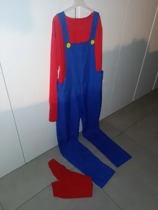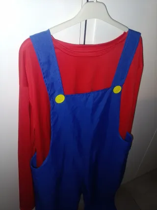 Disfraz inspirado en Mario Bros, ideal para fiestas o eventos - Camiseta roja de manga larga talla M - Peto azul con tirantes talla S - Dos botones amarillos en el peto. - Calcetines rojos