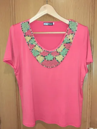 Camiseta de manga corta para mujer con un bonito detalle en el cuello. - Cuello adornado con pedrería multicolor. - Diseño original y llamativo.