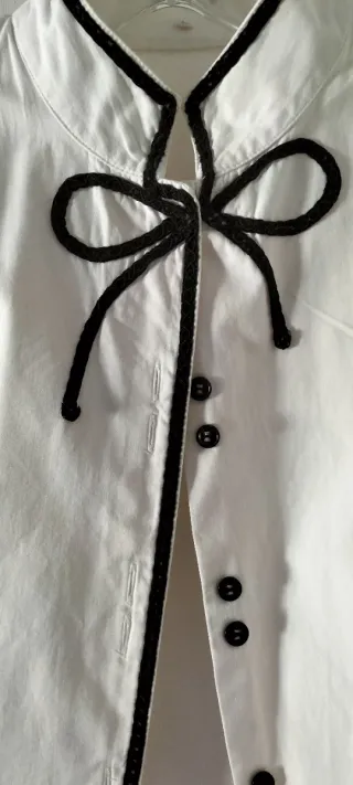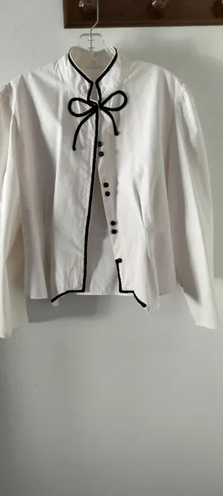 Camisa retro de algodón blanco con adornos negros de pasamanería. Cuello mao. Manga larga sin puño. Tejido de algodón. Cierre delantero con botones negros. Falta el último botón. Talla 40. Largo 68 cm