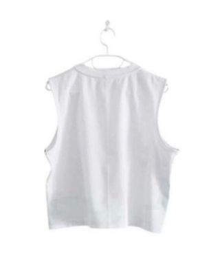 Top/camiseta blanca de manga corta con cuello alto y mangas de encaje transparente. Diseño con escote en forma de corazón. Talla: M (se ajusta de manera cómoda al cuerpo). Es una prenda liviana que transparenta (imagen 7), tiene una línea negra en la parte de atrás (imagen 6) que creo pueda irse lavándola. De ahí el precio.