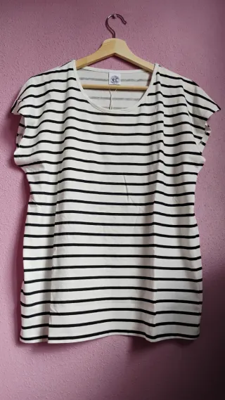 Camiseta de manga corta con un diseño de rayas finas. - Cuello redondo. - Tejido suave y cómodo. (Algodón) - Medidas en plano: Hombros 40 cm. Largo 62 cm.