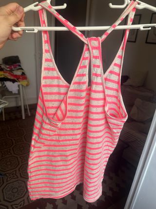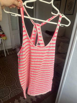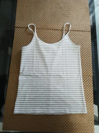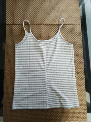 Camiseta de tirantes con un diseño a rayas. Presenta pequeñas aberturas laterales. - Diseño a rayas. - Aberturas laterales. La talla es M, pero da poca talla, a mí parecer es más una S