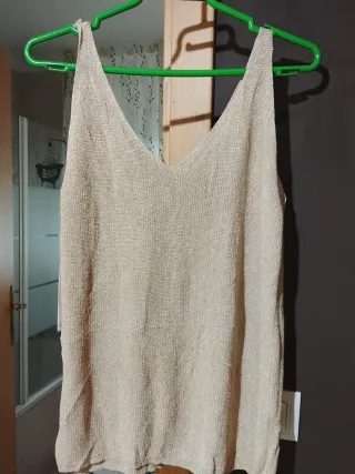 Top de tirantes con un diseño tejido y detalles brillantes. Perfecto para un look casual o elegante. - Tejido calado con hilo brillante. - Cierre de botones en la parte delantera. - Tirantes finos. - Bajo con acabado festoneado.