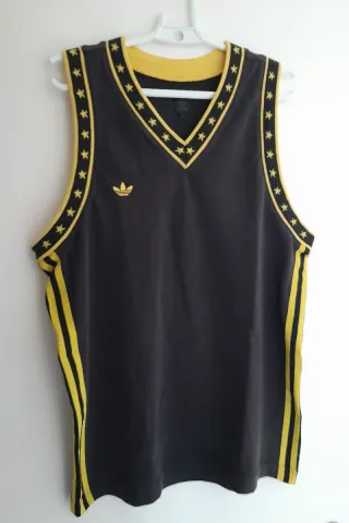 Camiseta de tirantes vintage de Adidas color azul marino y amarillo. - Cuello en V con ribete amarillo y estrellas. - Logo de Adidas en amarillo. - Bandas laterales con el clásico diseño de Adidas en amarillo.