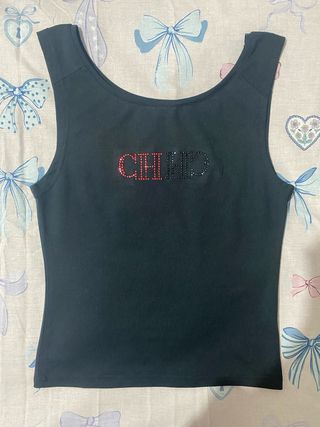 Camiseta sin mangas con detalle de pedrería. - Diseño con logo CH en pedrería. - Combinación de pedrería roja y negra.