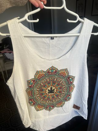 Camiseta de tirantes con un diseño llamativo. - Estampado frontal de mandala multicolor. - Detalle de hoja en el centro del diseño. - Etiqueta de marca en la parte inferior.