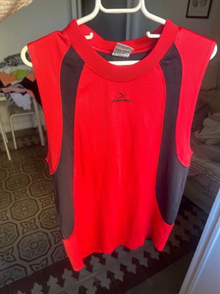 Camiseta de tirantes vintage de la marca Boomerang. - Diseño deportivo en color rojo y negro. - Cuello redondo. - Sin mangas.