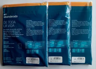 Pack de tres camisetas interiores de la marca Abanderado,nuevas a estrenar. 2 juegos con talla 48 y 1 con talla 52. - Camisetas de manga tirantes. - Tejido 100% algodón. - Corte clásico.