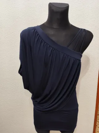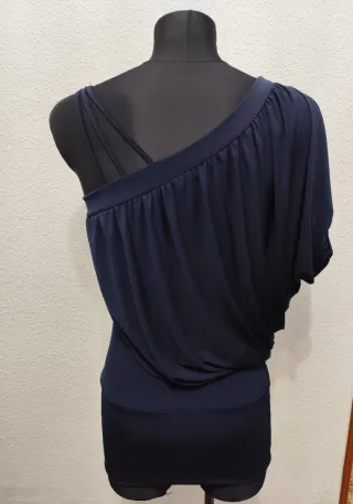 Camiseta de manga asimétrica en color azul marino. Presenta un diseño drapeado y tirantes finos. - Diseño de un solo hombro. - Tejido suave y fluido. - Detalle de tirantes cruzados.