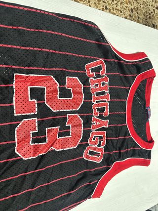 Camiseta de tirantes con diseño inspirado en el equipo de baloncesto Chicago Bulls. - Número 23 en grande. - Nombre CHICAGO en la parte frontal. - Rayas rojas sobre fondo negro.
