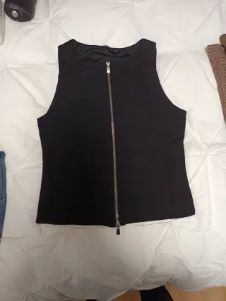 Camiseta sin mangas de Stradivarius con un diseño moderno y versátil. - Cremallera frontal plateada que se puede abrir desde arriba o desde abajo o ambas a la vez - Cuello redondo. - Corte entallado - De tirantes De tejido elástico para que se adapte al cuerpo. Vendo más prendas sin estrenar. Puedes verlas en mi perfil