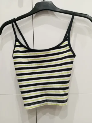 Este top de tirantes presenta un diseño de rayas llamativo. - Diseño de rayas horizontales. - Rayas verdes, blancas y negras. - Tirantes finos.