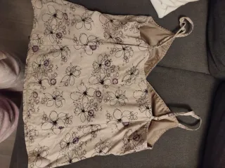 Camiseta de tirantes con un bonito estampado floral. - Diseño con flores en tonos beige y morado. - Detalle de encaje en la parte superior. - Tirantes finos. Hace buen escote para las que tenemos pecho. No marca barriga ya que hace volante la parte de abajo. Es genial si es tu estilo.