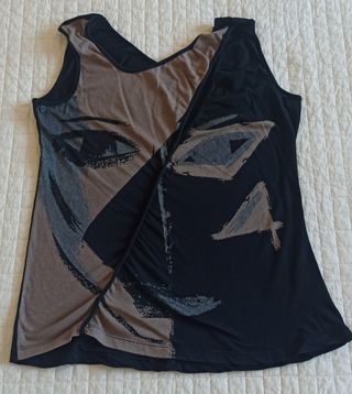 Camiseta de tirantes asimétrica tanto por delante como por la parte del cuello trasera y una abertura por delante. Marca Paramita. Talla L Original y muy especial. Usada pero en muy buen estado.