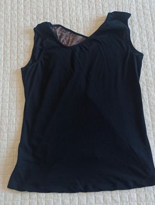 Camiseta tipo tirantes. Los tirantes quedan como un poco bajos. No sé la talla coma pero es pequeñita, supongo que puede ser una M, pero pongo las medidas.