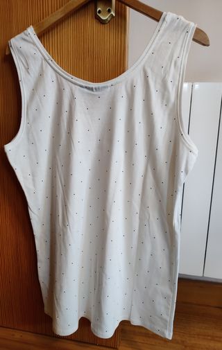 Vendo camiseta de mujer de tirantes de algodón, blanca con lunares negros. Es nueva a estrenar. Tiene todas las etiquetas originales. Comprada en Kiabi, en el departamento de tallas grandes. Talla: 50/52 - XXL.