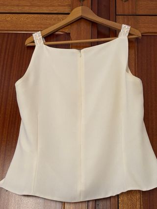Top sin mangas elástico con costura en pecho y lentejuelas en escote. Talla como una 4 pero es más una L. Usado 2 veces, está perfecto. - Escote en V con detalles. - Tirantes finos. - Tejido ligero, cómodo y elástico.