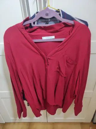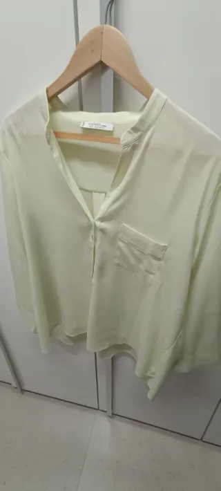Blusa verde claro con cuello tipo polo Marca talla L pero es más bien una XXL El tejido es parecido al lino, pero la etiqueta de la composición fue cortada.