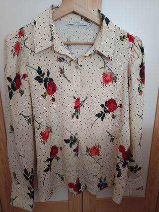 Camisa marca Violeta, talla curvy de Mango.Un solo uso. Color crema con detalles de flores en rojo y verde. Manga larga con puño abotonado. Hombros levemente abullonados con un poco de hombrera. Medida debajo de axila 59 cm.