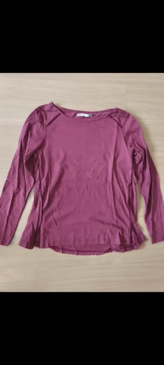 Camiseta de manga larga con un bonito tono burdeos. - Cuello redondo. - Costuras decorativas en los laterales y cuello. - Corte ligeramente acampanado en la parte inferior.