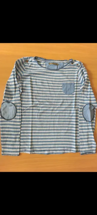 Camiseta de rayas con manga larga y detalles. - Cuello redondo con botones en los hombros. - Bolsillo en el pecho. - Parches en los codos.