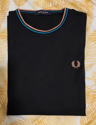 Camiseta de manga corta Fred Perry en coloe azul marino. Presenta un detalle de rayas en el cuello y mangas. - Cuello redondo con doble ribete. - Logo de laurel bordado en el pecho.