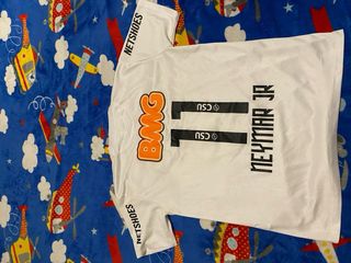 Camiseta de fútbol del Santos FC, modelo de la marca Nike. - Diseño blanco con detalles en naranja y negro. - Logo de Banco BMG en el frontal. - Escudo del club en el pecho. - Logos de Netshoes y Sears en las mangas.