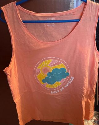 Camiseta sin mangas de mujer, corte un poco evasé. - Diseño ligero y versátil. - Tejido fino de color naranja coral. - Es "transparentosa" así que es ideal para llevar encima de otra camiseta. - Sin estrenar.