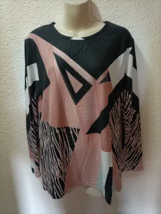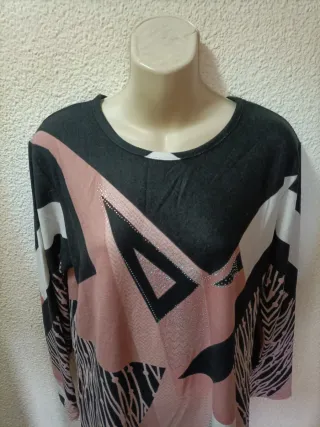 Camiseta de manga larga para mujer con un diseño geométrico y abstracto. - Estampado llamativo en tonos negro y rosa. - Detalles brillantes en la zona delantera. - Tejido suave y cómodo.