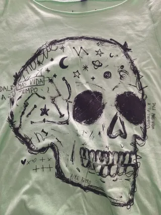 Camiseta de manga corta con un diseño original de calavera y elementos celestes. - Estampado frontal detallado. - Cuello redondo. - Tejido ligero y cómodo.