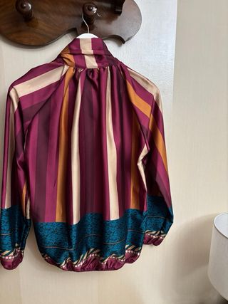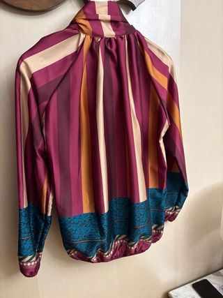 Elegante blusa con un diseño de rayas verticales en tonos morados y naranjas. El bajo de la blusa presenta un estampado geométrico en contraste. - Diseño de rayas verticales. - Estampado geométrico en el bajo. - Manga larga.