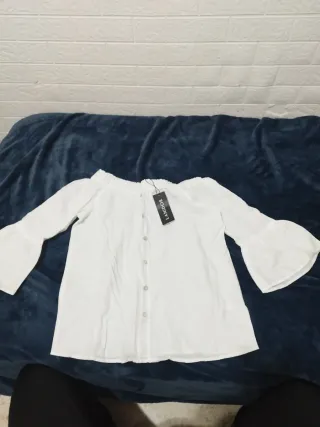 Características: Escote elástico tipo hombros descubiertos (off-shoulder) Botones frontales Mangas largas con corte ligeramente acampanado Tejido ligero y fluido.