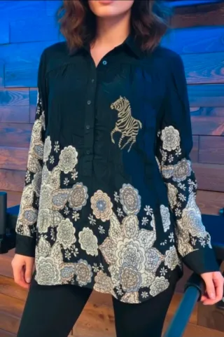 Camisa de manga larga con un diseño llamativo. - Estampado de flores y cebra. - Cuello camisero. - Cierre de botones.