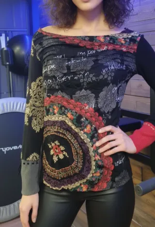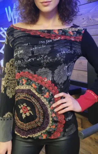 Camiseta de manga larga con un diseño vibrante y original. - Cuello barco. - Estampado floral y de mandalas. - Detalles de encaje y puntilla. - Puños de diferente color.