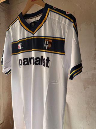 Camiseta de fútbol del Parma Calcio 1913 de la temporada 2002/2003. - Diseño clásico con detalles en azul y amarillo. - Logo de Parmalat en el frontal. - Escudo del club en la manga.