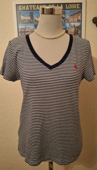 Camiseta de manga corta con cuello en V y estampado de rayas. Presenta un pequeño logo bordado en el pecho. - Diseño a rayas marineras. - Cuello en V con ribete. - Logo distintivo en el pecho.