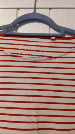 💰SOLO CON PAGO POR WALLAPOP. ▶️ELEGIR ENVÍO POR INPOST. NO ENVÍO POR CORREOS. Elige varios artículos de mi perfil, y paga sólo un envío No se reserva sin compra ➡️ También entrego en mano. 📍Camiseta de manga tres cuartos con un diseño de rayas. - Cuello redondo. - Estampado de rayas rojas sobre fondo blanco.