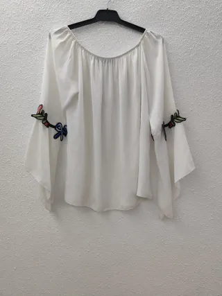 Blusa blanca con las mangas anchas, goma en la parte superior y un detalle de flores en las mangas. Es talla única pero sería una M/L