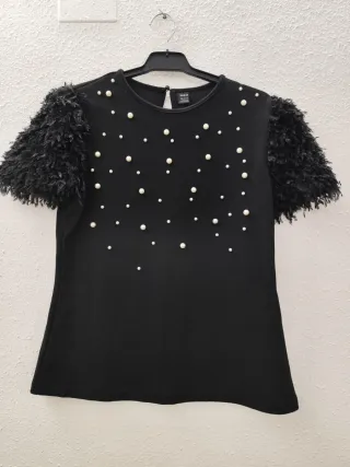 Camiseta arreglada, con perlas y plumas en las mangas