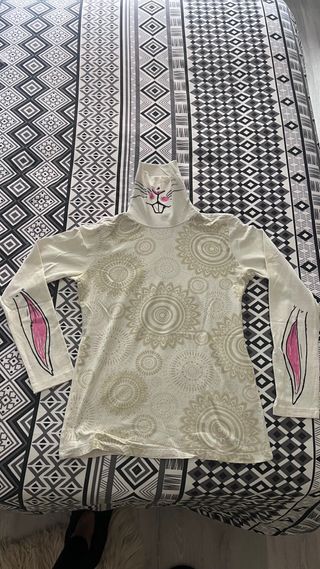 Camiseta de cuello alto con un diseño llamativo. - Estampado de mandalas en tonos beige. - Detalle de orejas de conejo en las mangas. - Cuello alto con cara de conejo pintada.