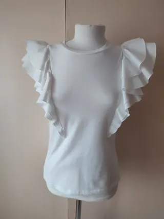 Camiseta blanca de Shein con un diseño moderno y femenino. - Volantes a modo de mangas. - Cuello redondo.