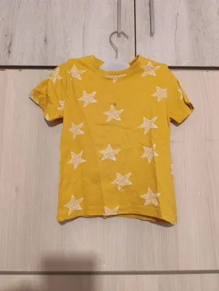 Camiseta de manga corta para niño con un divertido estampado de estrellas. Talla de 2-4 años Se ve de en conjunto o separado consultar precio y disponibilidad - Diseño de estrellas blancas sobre fondo amarillo. - Cuello redondo.
