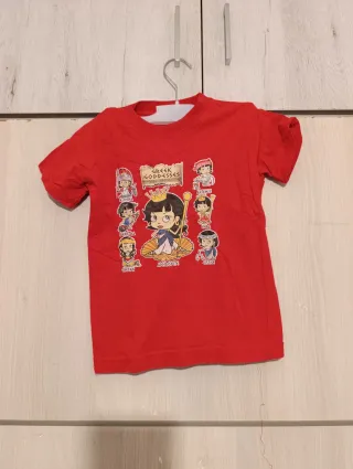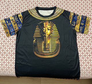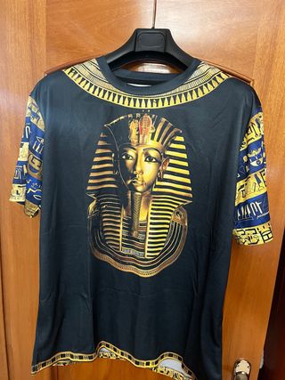 Camiseta con un diseño inspirado en el antiguo Egipto, luciendo la icónica máscara de Tutankamón. - Estampado frontal de la máscara de Tutankamón. - Detalles dorados y azules en mangas y cuello. - Diseño llamativo y original.