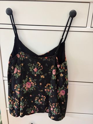 Camiseta de tirantes con un bonito estampado floral. - Diseño con flores rosas y amarillas sobre fondo negro. - Tirantes finos ajustables.