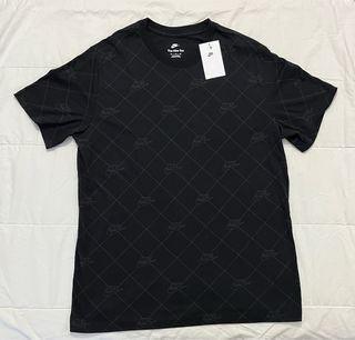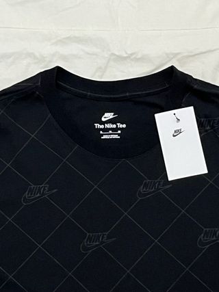 Camiseta negra de la marca Nike, modelo The Nike Tee. Presenta un diseño con el logo de Nike repetido en un patrón de rombos. Talla XL niño - Diseño con logo Nike repetido. - Cuello redondo. - Manga corta.