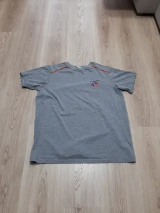 Camiseta de manga larga en tono gris. Presenta un diseño con detalles en naranja en los hombros y un pequeño logo bordado en el pecho. - Manga larga. - Cuello redondo. - Logo en el pecho.