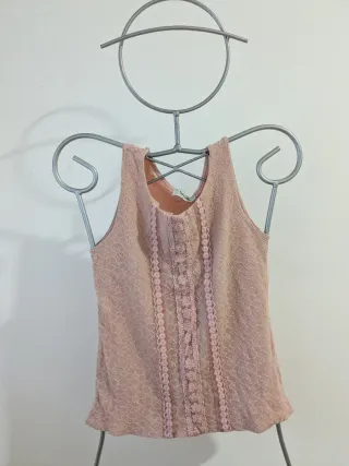 Bonito top sin mangas con un delicado encaje. - Diseño con tiras cruzadas en la espalda. - Detalle de pasamanería y pequeños adornos florales en el frontal.